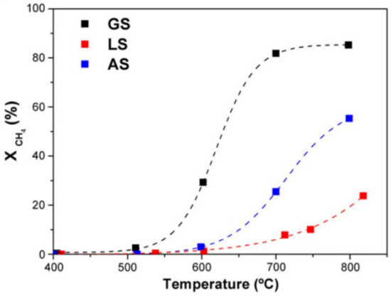 As a means of reducing CH4 emissions, a major challenge for the environment, the total catalytic oxidation of CH4 has been extensively studied [27,28,29,30,31]. The complete oxidation of CH4 into CO2 (a less potent greenhouse gas), particularly at low temperatures (below 500 °C), has been widely studied [32,33,34]. Since CH4 has the lowest carbon to hydrogen ratio among all hydrocarbon fuels, it generates the lowest amount of CO2 per unit of produced energy during combustion.