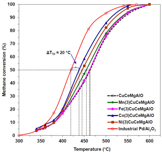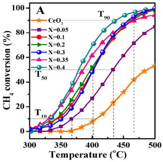 Among mixed oxides, perovskites or pyrochlore-type oxides [74,75,76,77,78,79], as well as transition metal-containing mixed oxides obtained from layered double hydroxides (LDH) precursors [80,81,82,83,84,85], proved to have high activity and good stability in methane combustion. It has been observed that the promotion of lanthanum oxide and Co3O4 or Co3O4–ZrO2 by cerium increases the activity of these catalysts [86,87].