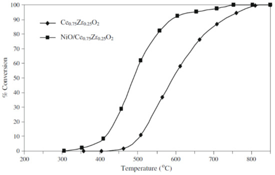 The conversion of methane versus temperature for the doped ceria catalysts. Reprint from [153]. Copyright (196), with permission from Springer.