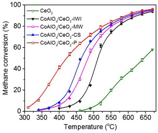 - Fan, X.; Li, L.; Jing, F.; Li, J.; Chu, W. Effects of preparation methods on CoAlOx/CeO2 catalysts for methane catalytic combustion. Fuel 2018, 225, 588–595. [Google Scholar] [CrossRef]