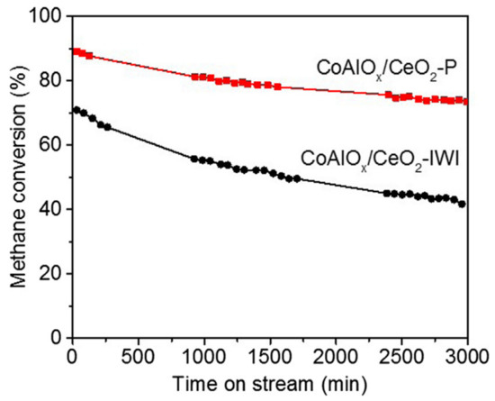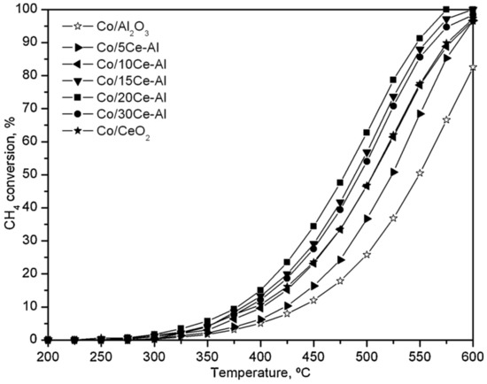 Cobalt oxides are widely studied for the total oxidation of methane [61,70]. It was observed that the morphology of nanostructured cobalt influenced methane catalytic oxidation. The Co3O4 nanostructures [71] prepared by a hydrothermal approach exhibited the following characteristics: nanosheets predominantly possessed exposed (112) planes, nano-cubes possessed exposed (011) planes, and nanobelts possessed exposed (001) facets. Highly porous Co3O4 nanorods are prepared by a simple hydrothermal method and compared to bulk Co3O4 prepared by the thermal decomposition of cobalt nitrate [72]. Co3O4 nanorods showed a higher activity for CH4 combustion, particularly for high GSHV (100,000 h−1) tests, due to their larger surface area and advanced porous structure. Co catalysts have shown high activity but low stability [73].