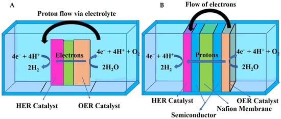 Artificial photosynthesis technology for solar energy into hydrogen processes: (A) wireless presentation and (B) wired configuration. Thus, it is preferable to use thinner catalyst layers in both situations. Adapted from [].
