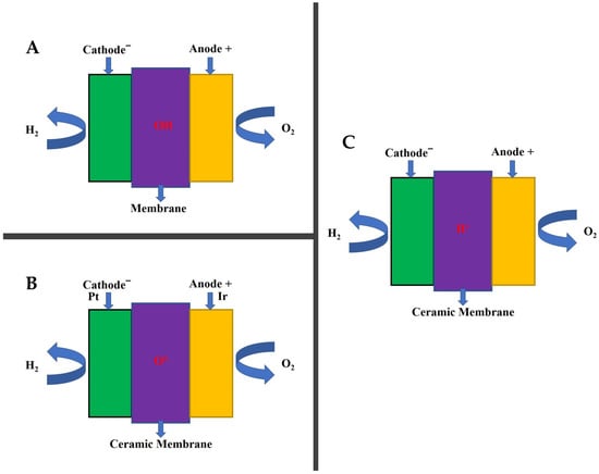 Schematic demonstration of (A) alkaline electrolysis, (B) solid oxide electrolysis, and (C) proton exchange membrane electrolysis. Reprint from []. Copyright (2021), with permission from Springer.