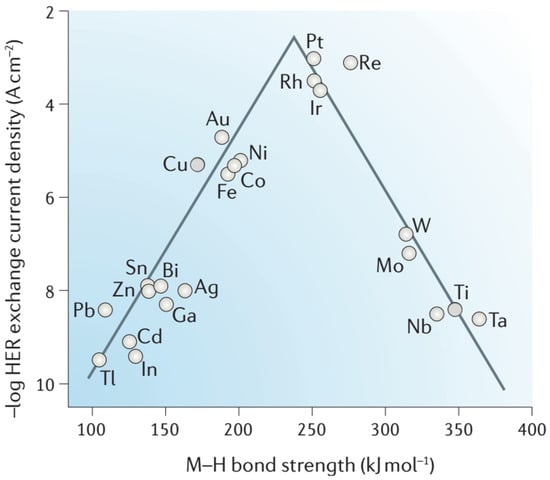 Trasatti’s volcano plot for hydrogen evolution reaction (HER). The plot shows the exchange current densities for HER versus the metal–hydrogen bond strength when H adsorbed on the electrode surface. Reprint from []. Copyright (2021), with permission from Elsevier.