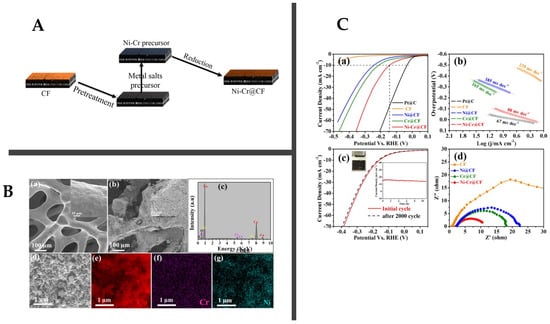 (A) Schematic illustration for the surface-modified Ni−Cr@CF, (B) corresponding SEM images (a,b) and elemental mapping of the selected area (c–g), (C) Prepared Ni−Cr@CF electrocatalyst with efficient HER performance, Tafel slope, stability test and Electrochemical impedance spectra (EIS) respectively (a–d). Reprint from []. Copyright (2021), with permission from Elsevier.