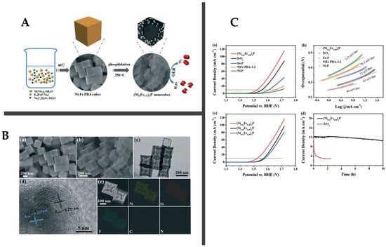 Xu and his co-workers reported highly efficient electrocatalyst based on Bimetallic phosphide hollow nanocubes synthesized from metal-organic frameworks (MOF). The as-prepared catalyst worked efficiently for OER. Hence, pointed out again that the fabrication of cost-effective, efficient, and durable catalysts based on Earth-abundant materials are critical for water splitting. The researchers employed a basic phosphorylation technique using MOF (Ni-Fe Prussian blue analog) as a template for novel bimetallic phosphide hollow nanostructures ((Ni0.62Fe0.38) P; Figure 5). The final product demonstrated a perfectly prepared hollow cubic structure with more surface area for reaction kinetics and synergistic effects due to the bimetallic interactions for electron transportation support towards enhancing the excellent activity of OER in extreme alkaline media with low onset potential, small Tafel slope, and good stability. Only 290 mV overpotential was needed to reach the current density of 10 mA cm−2, which is even more efficient for OER than monometallic phosphide Ni–P or Fe–P catalysts as well as the commercially available IrO2 catalyst [].