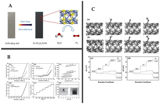 (A) Schematic illustration for preparation method, (B) Prepared electrocatalyst Fe−Ni3S2/FeNi with efficient OER performance (a,b), Tafel slope (c), stability test (d), Time-dependent current density curves (e) and the corresponding photographs of water oxidation device (f), (C) Density Functional Theory (DFT) calculations in Scheme (a–d) Reprint from []. Copyright (2021), with permission from Wiley.