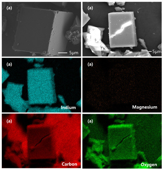 Figure 2 show SEM-EDS images of the synthesized CPM-200-In and CPM-200-In/Mg samples. The SEM images reveal that both CPM-200s have cubic like structures. As a result of EDS mapping, only In metal was observed in CPM-200-In, while In and Mg metals are well distributed in CPM-200-In/Mg.