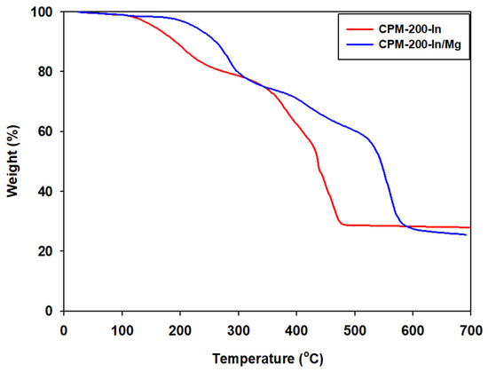 TGA results of CPM-200-In and CPM-200-In/Mg (Figure 4) showed an initial weight loss of solvent inside their pores around 130 °C and 200 °C. Even after the initial weight loss, CPM-200-In/Mg exhibited better thermal stability than CPM-200-In, probably due to the better crystallinity from the synergy effect of two metals during CPM-200-In/M crystallization process [60] and/or to the smaller micropore diameter for CPM-200-In/M compared to CPM-200-In.