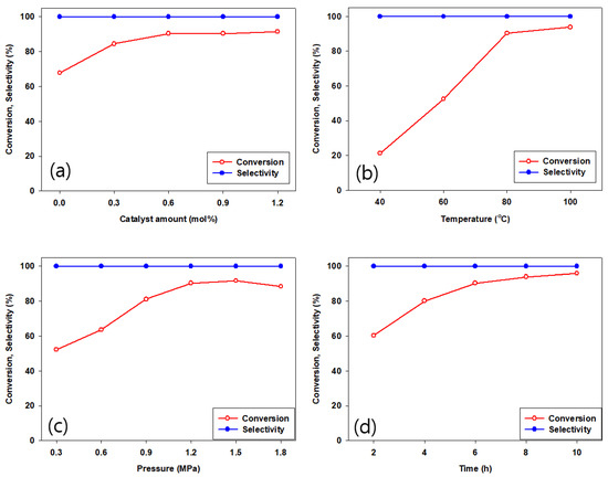 Various reaction parameters such as reaction time, temperature, catalyst amount, and CO2 pressure are optimized for the catalytic activity of CPM-200-In/Mg/TBAB system. As illustrated in Figure 8, with increasing temperature from 40 to 80 °C, ECH conversion increased steadily; however, a small increase in ECH conversion was shown with increasing reaction time from 8 to 10 h. A maximum in ECH conversion occurred at 1.5 MPa CO2 pressure, since excessive pressure decreased the concentration of ECH, disturbing the interaction between CPM-200-In/Mg/TBAB and the ECH [25,43]. The optimized reaction parameters were determined at 80 °C, CO2 pressure of 1.2 MPa, after 6 h, and with 0.6 mol% of CPM-200-In/Mg with TBAB co-catalyst.
