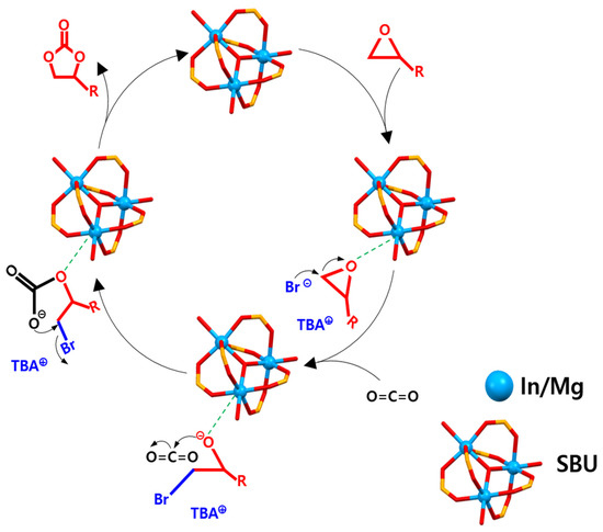 A plausible reaction mechanism based on the experimental results and our previous DFT studies [31,33,37] is proposed, for the cycloaddition of epoxide and CO2 catalyzed by CPM-200-In/Mg and co-catalyst (Scheme 2). In the first step, Lewis acidic metal centers interact with the O atom of the epoxide ring. Then, the Br− ion of the co-catalyst attacks the least hindered C atoms of epoxide, resulting in the ring opening of epoxide. Thereafter, the generated partial positive charge on the carbon atom of epoxide polarizes the CO2 molecule. Finally, the cyclic carbonate is generated by the ring closure with the elimination of the bromide ion. The synergistic role of acidic sites (Lewis acidic In and Mg metal sites) and basic sites (Lewis basic motif inside MOF pores) seems essential for the improved catalytic performance of CPM-200-In/Mg.