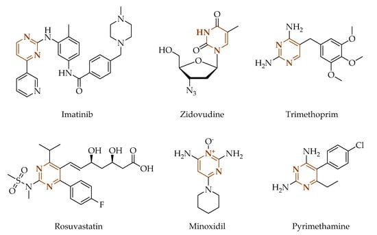 Representative drugs with pyrimidine moiety on the market: anticancer (e.g., imatinib [6]), antiviral (e.g., zidovudine [7]), antibacterial (e.g., trimethoprim [8]), antihyperlipidemic (e.g., rosuvastatin [9,27]), antihypertensive (e.g., minoxidil), and antimalarial (e.g., pyrimethamine).