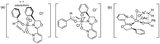 Better results were achieved for pyridine N-oxide oxazolines 4 (12–90% yield, 19–71% ee). For all, i.e., pyridine N-oxide, 3,5-lutidine N-oxide, and isoquinoline N-oxides oxazolines, the same tendency was observed. The highest enantioselectivity was observed when the catalyst with (S)-phenyl-glycinol fragment was applied (71% ee for 4c, 79% ee for 10c, and 57% for 20c). Changing the solvent to dichloromethane (for 4c) did not improve the results. The obtained yield was slightly higher (from 21% to 26%) while the enantioselectivity decreased (from 71% to 62%). A control experiment using 2,2’-bipyridyl N-oxide as a catalyst gave the allylation product with a yield of 24%, but racemic (see Figure S30), whereas, without the catalyst, reaction does not occur. The highest efficiency was obtained for the catalyst with a camphor-derived fragment, but with simultaneous racemization. These findings indicate that π–π interactions might play an important role during the creation of the transition state, increasing the enantioselectivity, while the mono-terpenoid fragment with strong steric requirements enables high efficiency but not stereoselectivity. The assumed transition state options in the allylation reaction are shown in Figure 2a. One of these structures shows the possible parallel orientation of both aromatic rings, of the catalyst and the substrate. Such π–π electronic interactions can additionally support the observed enantioselectivity. Similar effects have been discussed in the literature [40]. In the case of reactions with catalysts that do not allow such interactions, the obtained ee value is significantly lower.