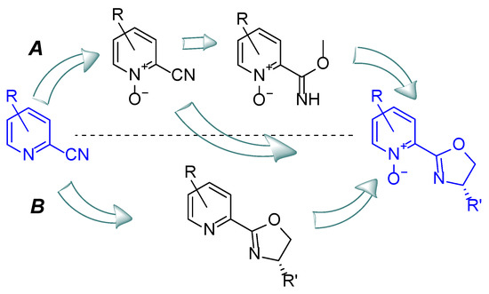 In general, heteroaromatic N-oxides have been easily obtained via oxidation of heterocycles. The procedure for the methyltrioxorhenium (MTO) mediated oxidation of pyridines was developed by Sharpless [18], but despite its simplicity and efficiency it has several limitations. Procedures using m-chloro-peroxy-benzoic acid (m-CPBA) in mild conditions seem to be more universal [19]. There are two general approaches to obtain an oxidized nitrogen atom in the designed bifunctional compounds, shown in Scheme 1. The first assumes oxidation before oxazoline ring closure (A), while the second consists of the oxidation of previously received heteroaromatic-oxazoline-type compounds (B). The introduction of an oxazoline ring into the molecule can be accomplished by reacting the chiral amino alcohol with an oxidized or non-oxidized aromatic nitrile or carboximidate.