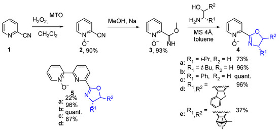 The alternative approach, involving the reaction of 2-pyridine N-oxide imidate with amino alcohol in the presence of molecular sieves in toluene at elevated temperature, previously reported as effective in the preparation of appropriate pyridine-oxazoline derivatives [32], has been introduced. However, after five days of reaction, the unreacted substrates were still observed; moreover, the purification by acidic extraction or column chromatography led to partial hydrolysis of the product. Hence, it was necessary to conduct a reaction for a time that provided a complete conversion of substrates. The optimum was achieved after seven days of the reaction. For the preparation of chiral oxazoline derivatives, different commercially available amino alcohols were used, as well as the amino alcohol obtained from camphor quinone according to the procedure described in the literature [33]. The nine novel chiral oxazoline N-oxides—five with pyridine N-oxide fragment (4a–e) and the four with 2,2’-bipyridine N-oxide fragment (5a–d)—have been obtained using this procedure, with generally high overall yields (Scheme 2). When 2-bipyridyl cyanide was applied as a substrate, oxidation took place in the unsubstituted pyridine ring, according to previous literature reports [25] (observation confirmed by NMR correlation spectra). Therefore, the finally obtained chiral N-oxide-oxazoline derivatives (5a–d) have a slightly different structure than respective N-oxide-pyridine derivatives, and the oxazoline ring was at a long-distance from the N-oxide moiety.