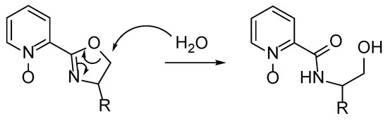 Oxazolines containing azaaromatic N-oxides tended to be not very stable. In simple tests, it was confirmed that the obtained chiral oxazoline N-oxides are unstable, sensitive to moisture and other factors. They decomposed/hydrolyzed to opened hydroxy amides during preparative chromatography or when not stored under neutral conditions. The respective amido-alcohol formed by opening the oxazoline ring was identified as the transformation product.