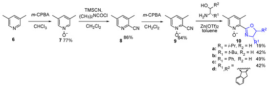 Transformation of 2-cyano-3,5-lutidine into respective imidate provided caused some problems. The reaction of 2-cyano-3,5-dimethylpyridine (8) did not occur at all, while the reaction of corresponding N-oxide (9) proceeded with a very low yield of about 13%; moreover, even a three-fold increase of solution concentration did not affect efficiency. An attempt consisting of the direct reaction between 2-cyano-3,5-lutidine (8) and chiral amino alcohol in the presence of Zn(OTf)2 as a catalyst, followed by the oxidation of received oxazoline with m-CPBA (70%), gave a low yield, e.g., only 10% of the overall yield resulted in the case of (1R,2S)-(+)-cis-1-amino-2-indanol. More effective was the direct oxazoline ring closure reaction of previously obtained 2-cyano-3,5-lutidine N-oxide (9) with the chiral amino alcohols. Finally, lutidine-oxazoline N-oxide derivatives (10a–d) were obtained in low to moderate yields (19–49%, see Scheme 4).
