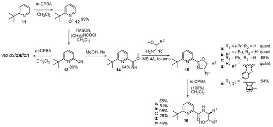 Another procedure turned out to be necessary for the 2-tert-butylpyridine derivative. Its 6-carbonitrile (13) proved to be resistant to oxidation with common oxidants such as H2O2 or m-CPBA, but the formation of the corresponding carboximidate (with sodium methanolate) was very efficient (94% yield). This fact opened the path for the synthesis of oxazoline-derivatives via ring closure in the presence of molecular sieves, which was efficient in the preparation of pyridine and bipyridine oxazolines (see Scheme 5). Novel chiral 6-tert-butylpyridine oxazolines (15c, 15d) with good overall yield were obtained. The same strategy was highly efficient also in preparing previously reported derivatives (15a and 15b, [22,35]); however, their oxidation failed. However, considering their moisture sensitivity, 100% m-CPBA was used for the oxidation reaction. Despite the precautions taken, in this case too opening of the oxazoline ring took place and the corresponding hydroxy amides were isolated as the only products (16a–e).