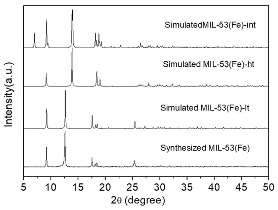 XRD patterns of the synthesized and three simulated MIL-53s.
