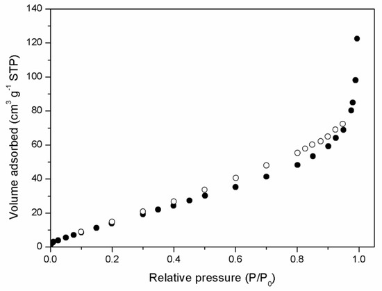 The nitrogen adsorption–desorption isotherm of the as-synthesized MIL-53(Fe) is presented in Figure 2. It displays the profile of mixed type I and IV isotherms, typical of microporous and mesoporous materials, respectively. The specific BET surface area (SBET = 79 m2 g−1) was obtained applying the BET equation to the section of the isotherm in the relative pressure range of 0.05–0.35, the microporous volume (Vmicro = 0.012 cm3 g−1) and external surface area (Sext = 19 m2 g−1) were calculated by the t-plot method, and the total pore volume (VT = 0.124 cm3 g−1) was estimated as the volume corresponding to the branch of desorption of the isotherm at a relative pressure of 0.96. In general, these values agree well with those reported in the literature for MIL-53(Fe), typically, with SBET and VT in the 15–90 m2 g−1 and 0.01–0.3 cm3 g-1 ranges, respectively [13].