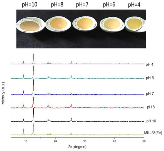 First, the effect of pH on the stability of MIL-53(Fe) in water at 25 °C was investigated. Figure 7 displays XRD results of samples after being soaked in different pH Milli-Q water for 20 days. Regardless of the initial pH, the XRD patterns remained unchanged after exposure of MIL-53(Fe) to water, suggesting retained crystallinity. Additionally, no drastic changes were appreciated in FTIR results (not shown). However, a noticeable color change of the solid, from pale-orange to reddish-brown, was observed after the test carried out at initial pH 10 (Figure 7), which is a sign of the formation of hydrated iron species.