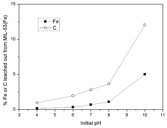Figure 8 shows the percentages of iron and carbon leached out from MIL-53(Fe) samples after prolonged contact with water. All dissolved organic carbon (DOC) found in solution in each experiment was due only to H2BDC molecules displaced from the solid, thus ruling out the formation of other carbonaceous products from the hydrolysis reaction. From Figure 8, it is apparent that MIL-53(Fe) stability decreased with initial pH, as the hydrolysis reaction of the MIL-53 structure was favored at alkaline conditions [57]. Thus, as much as 5% and 12% of iron and carbon, respectively, were leached out from the solid at pH 10, resulting in 1.5 and 11.1 mg L−1 aqueous iron and DOC, respectively, whereas at pH 4, little DOC (1.8 mg L−1, i.e., 3.1 mg L−1 H2BDC) and negligible iron (<0.15 mg L−1) were found in solution. Nevertheless, it should be taken into account that iron in solution might underestimate the actual amount of this metal withdrawn from the MIL-53(Fe) structure since small particles of free iron oxides species (e.g., amorphous oxyhydroxides) resulting from partial hydrolysis of the framework could be deposited on the surface of MIL-53(Fe) [51]. The negative effect of the pH on the water stability of MIL-53(Fe) here found agrees with that recently reported for other iron-carboxylate MOF, namely, MIL-100(Fe) [53]. Accordingly, pH must be controlled in the acidic range to hinder the hydrolysis of iron-carboxylate frameworks to some extent.