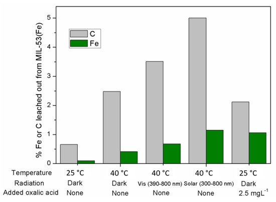 A series of experiments where MIL-53(Fe) samples were soaked in Milli-Q water at initial pH 4.5 and constant temperature for 7 h was carried out to examine the impact of temperature (25 °C and 40 °C) and radiation (solar and visible radiation) on the stability of MIL-53(Fe). Aqueous pH slightly decreased throughout all the tests in the 4.5–4.1 range. As shown in Figure 9, the amounts of iron and carbon leached out from MIL-53(Fe) were affected by both temperature and radiation. In the absence of radiation, temperature exerted a negative impact on MIL-53(Fe) stability likely because of increases in the rate of the hydrolysis reaction (1) and in H2BDC solubility. Both visible and simulated solar radiation also accelerated the leaching of carbon and iron from the framework structure, being the effect of solar radiation stronger. This suggests that the photogeneration of holes (h+) and ROS from MIL-53(Fe) activation under visible or solar radiation might contribute to decarboxylation of the MOF to some extent: