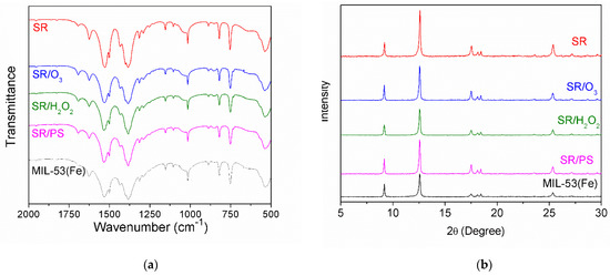 ATR-FTIR spectra (a) and XRD patterns (b) of MIL-53(Fe) after exposure to radiation and oxidants. MIL-53(Fe) treatment conditions: SR = Simulated solar radiation for 7 h; SR/O3 = Simulated solar radiation/ozone (1 mg min−1) for 1 h; SR/H2O2 = Simulated solar radiation/hydrogen peroxide (75 mM) for 1 h; SR/PS = Simulated solar radiation/potassium persulfate (2.5 mM) for 1 h.