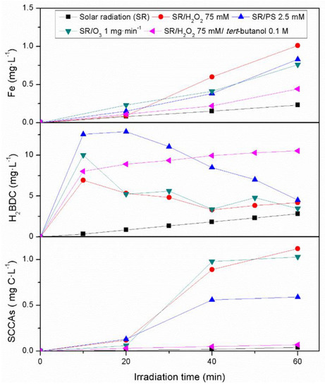 The degradation of aqueous H2BDC by ROS resulted in the accumulation of SCCAs in solution as shown in Figure 11. This is in agreement with previous studies where some SCCAs such as muconic acid, fumaric acid, maleic acid or oxalic acid were identified as products of advanced oxidation of aqueous H2BDC [61,62]. The generated SCCAs might also contribute to prevent iron precipitation and to enhance the production of ROS through organic complexation of Fe(III) (e.g., ferric-oxalate complexes). Under UV-vis radiation, Fe(III)-carboxylate complexes can undergo photolysis with formation of HO• and the pair HO2•/•O2− [63], activate PS decomposition into SO4−• and HO• [64] or improve the HO• yield in photo-Fenton-like and photo-ozonation processes [65,66]. Moreover, as discussed above, some SCCAs (e.g., oxalate) have the ability to extract iron from solids through complex formation. In line with this, Figure 11 shows that dissolved iron concentration in runs carried out in the presence of oxidants increased specially after 20 min when the concentration of SCCAs started to be significant.