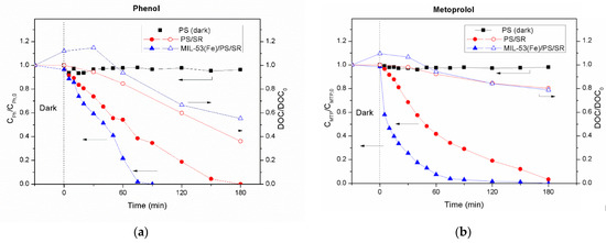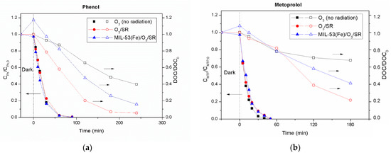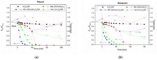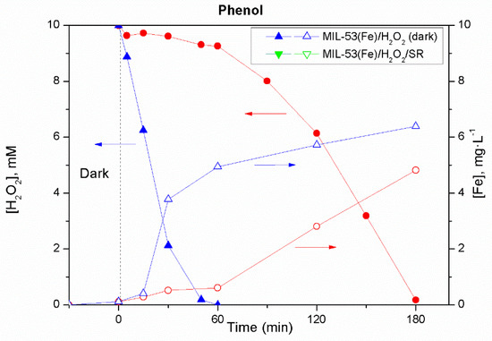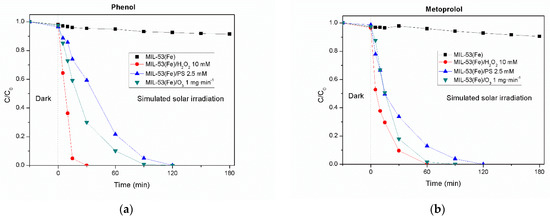 The effect of H2O2 on the degradation of Ph and MTP is illustrated in Figure 15. It is clearly seen that the H2O2/SR system barely eliminated 10% of the target pollutants in 3 h of reaction despite the fact that hydrogen peroxide may undergo photolytic breakdown into ROS under illumination by solar radiation [60]. However, the MIL-53(Fe)/H2O2 processes both in the dark and under simulated solar radiation led to complete removal of the pollutants in less than 2 h and 1 h, respectively.