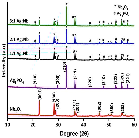 This work aimed to produce a stable visible-light-driven photocatalyst by coupling Ag3PO4 with Nb2O5. There are very few works on Ag3PO4/Nb2O5 photocatalysts available in the literature []. To the best of our knowledge, using a fluorescence lamp (23 W) as a source of light irradiation to degrade a dye over Ag3PO4/Nb2O5 photocatalysts has not been reported. Previously, the degradation of rhodamine B over Ag3PO4/Nb2O5 under simulated sunlight irradiation (Xe, 600 W) was reported []. In this work, Ag3PO4/Nb2O5 photocatalysts were synthesized via the deposition–precipitation method, and their photocatalytic activity was evaluated by the photodegradation of methyl orange (MO) under fluorescent light (23 W) irradiation. The experiments were performed under various parameters in order to determine the best-suited conditions for the degradation of MO. The effect of scavengers and a reusability test were conducted in order to determine the active species responsible for the degradation, and to evaluate the stability of the catalysts, respectively