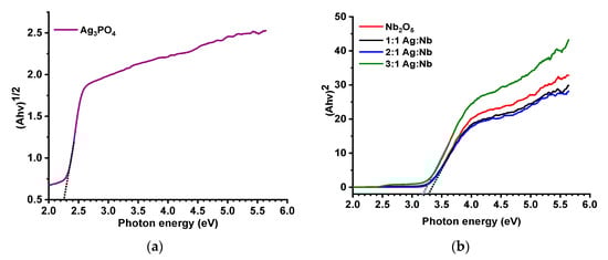 The optical response of the catalysts in the visible light region was determined using the UV–Vis DRS spectrum. The data collected was transformed using the Kubelka-Munk function, and the band gap energy was extrapolated from the intercept of the x-axis of the Tauc plot (Figure 2). The band gap energy of Nb2O5 (3.3 eV) and Ag3PO4 (2.3 eV) is similar to the values reported in the literature [,]. Upon the addition of Ag3PO4, the band gap energy of Nb2O5 slightly decreased to 3.2 eV.