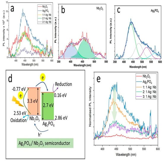 The optical properties and band structure of the samples were further evaluated using steady-state photoluminescence analysis. The results are presented in Figure 3. For the Nb2O5, two broad peaks ranged from (i) the UV region: 350 nm to 400 nm, and (ii) the visible region: 400 nm to 550 nm. From Figure 3b, the first deconvoluted peak (blue) can be ascribed to the near band edge emission of the bulk Nb2O5 samples, whereas the second peak (green) can be referred to as the defect-assisted band alignment transition []. The Ag3PO4 sample also showed a broad emission peak from 400 nm to 600 nm, which can be deconvoluted into four peaks via Gaussian function analysis. The peaks were located at the wavelength 425 nm (violet), 480 nm (blue), 525 (green), and 575 nm (green). This result is consistent with the literature, stating that the carrier recombination arose from the shallow defect between the [PO4] and highly distorted tetrahedral [AgO4] clusters []. Upon the incorporation of Ag3PO4 into the Nb2O5 at a 1:1 molar ratio, it was found that the PL emission at the visible region from 400 nm to 600 nm (shallow defect) was quenched. This phenomenon signifies that the carrier recombination becomes more dominant in the heterojunction structure than the direct band edge at UV region of Nb2O5 (blue region in Figure 3b). In order to further evalutate the peak quenching, a normalised peak with respect to the direct band edge of Nb2O5 (382 nm) was conducted for all of the Ag3PO4/Nb2O5 and Nb2O5 samples. The result is presented in Figure 3d. It can be observed that the further increases of the Ag content in Nb2O5 have proved to suppress the PL intensity further in the shallow defcet states, as compared to the Ag3PO4 sample. None of the defect states were observed in the Nb2O5 semiconductor material. This observation may be atttributed to the agglomeration of the Ag3PO4 cluster, which contributed to the bulk trapping states. It is also worth mentioning that the increased Ag concentration can alter the charged polarization between the distorted Ag cluster, and could eventually promote intrinsic and extrinsic defect trapping states in the electronic structure of the Nb2O5 semiconductor materials. The plausible charge transfer mechanism is illustarted in Figure 3e. For the Nb2O5 sample, a charge trasfer only occured between the valance band and the conduction band of the semiconductor material. For the Ag3PO4/Nb2O5 sample, a charge carrier was photoexcited from the valance band to the conduction band of Nb2O5 under the simulated sunlight. The charge carrier was later transferred to the conduction band of Ag3PO4 before it further underwent the reduction process with the analyte during the photodegradation process. Therefore, it is believed that the Ag3PO4/Nb2O5 semiconductor materials served as better photocatalysts than Nb2O5, owing to its two charge transfer pathways, which lower the direct carrier recombination in the Nb2O5 semiconductor.