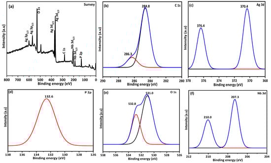 (a) XPS survey spectrum and high resolution spectra of (b) C 1s, (c) Ag 3d, (d) P 2p, (e) O 1s, and (f) Nb 3d of 2:1 Ag:Nb.