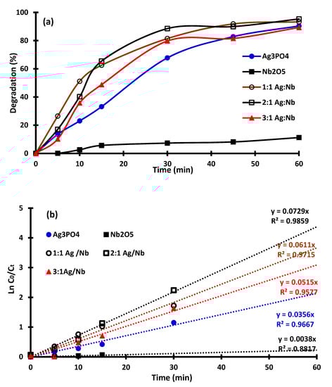 Plot of (a) the percentage degradation and (b) ln C0/C against the irradiation time for the pure Ag3PO4, pure Nb2O5, and Ag:Nb = 1:1, Ag:Nb = 2:1 and Ag:Nb = 3:1 photocatalysts.