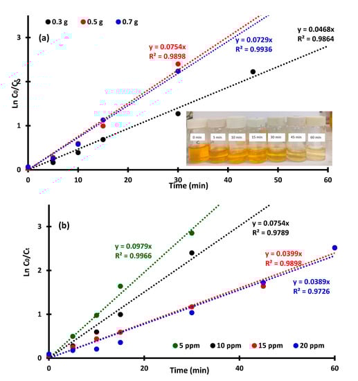 where C0 is the initial MO concentration, Ct is the MO concentration at a time ‘t’, and V is the volume of the MO solution used in the reaction.