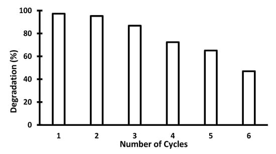 The catalyst’s lifetime is an essential parameter of the photocatalytic degradation process, so it is crucial to evaluate the catalyst’s reusability for practical applications. As shown in Figure 9, the decrease in the photocatalytic efficiency of the Ag:Nb = 2:1 photocatalyst was gradual, but remained above 60% up to the fifth cycle of the photodegradation experiment. This gradual loss might be due to the self-photo corrosion of Ag3PO4. The enhanced photocatalytic activity and stability of the Ag:Nb = 2:1 photocatalyst may be due to the insoluble Nb2O5 layer, which can effectively protect the dissolution of Ag3PO4 to Ag+ ions, thus improving the structural stability of the photocatalyst.