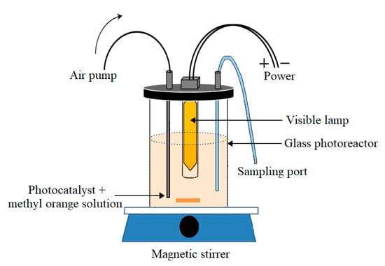 The photodegradation of methyl orange dye (MO) was performed in a glass photoreactor, as shown in Figure 10. A fixed amount of photocatalyst was added into 0.5 L of 10 ppm MO solution and stirred in the dark for 30 min. Air was bubbled into the solution throughout the experiment in order to ensure a constant supply of oxygen. During irradiation with a compact fluorescent lamp (23 W, Phillips, 1600 Lumens), an aliquot of the sample was withdrawn from the bulk solution at predetermined time intervals and filtered to remove catalyst particles. The samples were analyzed using UV–vis Perkin-Elmer Lambda 30 spectrophotometer at λmax of 464.4 nm in order to determine the MO dye’s residual concentration. The percentage of degradation and the amount of MO degraded are calculated using Equations (1) and (2), respectively: