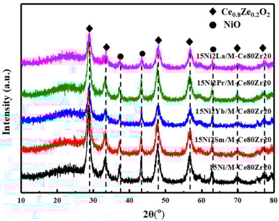 Furthermore, the values of the specific surface areas, pore volumes, and average pore diameters of the 15Ni2R/M-Ce80Zr20 (R = La, Sm, Pr, Yb) catalysts are summed up in Table 1. It was noted that the specific surface area of the 15Ni2R/M-Ce80Zr20 catalyst was larger than that of the 15Ni/M-Ce80Zr20 catalyst. This suggested that the loading of the Ni and the rare earth caused the partial blockage of the mesoporous channels of the catalysts. However, the average pore diameters of these catalysts did not suffer any decrease. This demonstrated that the catalyst successfully retained the mesoporous skeleton and provided sufficient thermal stability.