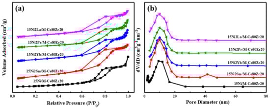 The structural properties of the 15Ni2R/M-Ce80Zr20 (R = La, Sm, Pr, Yb) catalysts were investigated by N2 physisorption. The N2 adsorption-desorption isotherms and pore size distributions of the 15Ni2R/M-Ce80Zr20 (R = La, Sm, Pr, Yb) catalysts are displayed in Figure 2. As can be observed in Figure 2a, all the catalysts displayed the type IV H2-shaped isotherms based on the IUPAC classification [40]. Therefore, the catalysts still maintained the mesoporous structure after loading the metal and calcination. Furthermore, the mesoporous catalysts in Figure 2b showed the pore diameter distribution with the peaks in the 9.9 nm range. Compared with the 15Ni/M-Ce80Zr20 catalyst, the 15Ni2R/M-Ce80Zr20 catalysts displayed slightly bigger pore diameters. This indicated that the shrinkage of the mesoporous framework was effectively inhibited after the preparation and calcination of the catalysts [40].