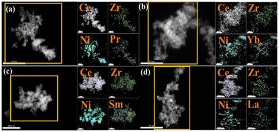 STEM-EDS element mapping images showing the spatial distribution of Ce, Zr, Ni, and R (R = La, Sm, Pr, Yb) elements: (a) 15Ni2Pr/M-Ce80Zr20, (b) 15Ni2Yb/M-Ce80Zr20, (c) 15Ni2Sm/M-Ce80Zr20, (d) 15Ni2La/M-Ce80Zr20.