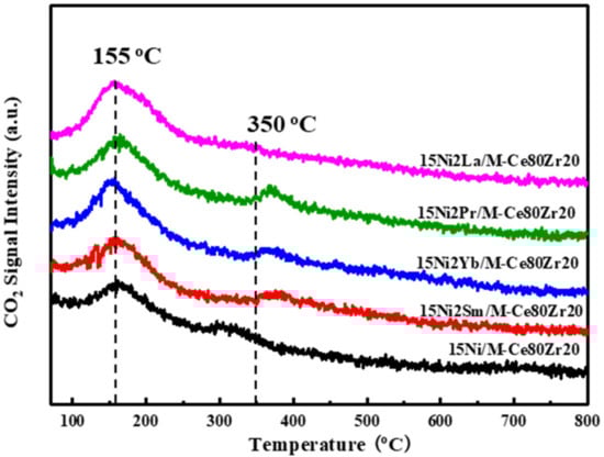 The CO2-TPD analyses of the 15Ni2R/M-Ce80Zr20 (R = La, Sm, Pr, Yb) catalysts were conducted to characterize the surface alkalinity of the catalysts. It is universally accepted that the CO2 chemisorbed over the strong alkaline sites could be desorbed at high temperature because the strength of the catalyst basicity could be closely related to the desorption temperature [41]. As can be seen from Figure 6, the CO2-TPD profile shapes of all these catalysts were similar. Specifically, they found two groups of CO2 desorption peaks around 155.0 °C and 350.0 °C, suggesting that both weak (155 °C) and strong (350.0 °C) alkaline sites with different intensities existed in these catalysts [42,43]. In addition, compared with 15Ni/M-Ce80Zr20, the rare earth doped 15Ni2R/M-Ce80Zr20 (R = La, Sm, Pr, Yb) catalysts of the CO2 desorption peak was stronger, demonstrating that the rare earth greatly increased the number of surface basic sites. This proved that rare earth (La, Sm, Pr, Yb) could promote the improvement of surface basic sites [44,45,46,47,48]. The surface basic sites enhanced by rare earth contributed to the low temperature activation of CO2 methanation.