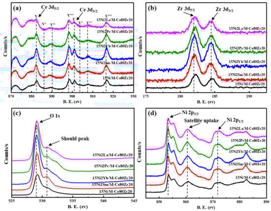 The XPS measurement of the 15Ni2R/M-Ce80Zr20 (R = La, Sm, Pr, Yb) catalysts were applied to obtain the detailed coordination states and more detailed information about the surface elements. The Ce 3d, Zr 3d, Ni 2p, and O 1s XPS profiles of 15Ni2R/M-Ce80Zr20 are shown in Figure 7. The Ce 3d spectrum in Figure 7a was divided into eight overlapping peaks. According to previous reports, these peaks could be divided into Ce 3d5/2 (V, V′, V″, V‴) and Ce 3d3/2 (U, U′, U″, U‴) [49]. The U (901.0 eV), U″ (908.0 eV), U‴ (917.0 eV) and V (882.0 eV), V″ (889.0 eV), V‴ (901.0 eV) peaks were derived from the Ce4+ cation in +4 valence. These were caused by electrons moving from a complete O 2p orbital to an empty Ce 4f orbital. The presence of U′ and V′ in the Ce 3d spectrum indicated that Ce3+ exists in the +3 valence state [50,51,52]. Therefore, it could be concluded that there were +4 and +3 cerium surface types of the 15Ni2R/M-Ce80Zr20 catalysts studied, and Ce4+ was the predominant species. The Zr 3d spectra of catalysts are displayed in Figure 7b. As could be observed, almost all catalysts displayed the Zr 3d spectra with Zr 3d5/2 peaks centered around 182.0 eV, which corresponded to the Zr4+ in the +4 oxidation state [53]. From the O 1s spectra of these catalysts in Figure 7c, it was noteworthy that almost all catalysts had main peaks and shoulder peaks at 530.0 eV and 533.0 eV, respectively, indicating the presence of O2−. The appearance of acromion was related to the nonequivalence of the oxidation environment. It has been reported that the acromial peak near 533.0 eV corresponds to O2− bound with Ce3+. As a result, the oxygen vacancy was formed around the Ce3+ species to maintain the charge neutrality [49,54]. Thus, the O 1s shoulder peak at higher binding energy could be generated. The Ni 2p spectra of these catalysts are shown in Figure 7d. It can be clearly seen that each catalyst had a Ni 2p3/2 main peak at 854.0 eV and a Ni 2p1/2 main peak at 872.0 eV. Compared with pure NiO (Ni 2p3/2, 853.6eV), the 15Ni2R/M-Ce80Zr20 catalysts had a higher binding energy [55,56]. Therefore, the above H2-TPR analysis confirmed that the oxidation state of Ni species in these catalysts mainly existed in the form of Ni2+, and there was a strong metal–support interaction.