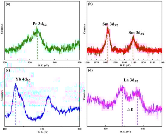 Furthermore, the XPS spectra of the Pr 3d, Sm 3d, Yb 4d, and La 3d of the 15Ni2R/M-Ce80Zr20 (R = La, Sm, Pr, Yb) catalysts are shown in Figure 8. As showen in Figure 8a, the Pr 3d spectra of the 15Ni2Pr/M-Ce80Zr20 catalyst displayed a Pr 3d5/2 peak at 933.0 eV. This was different from the Pr 3d5/2 peaks of PrO2 (935.0 eV) and Pr2O3 (932.9 eV), and might be a mixture of PrO2 and Pr2O3 [57]. During the methanation of CO2, the change in valence state would produce an oxygen vacancy and activate the C=O bond of CO2. The Sm 3d spectrum of 15Ni2Sm/M-Ce80Zr20 (Figure 8b) showed the Sm 3d5/2 peak near 1082.0 eV and the Sm 3d3/2 peak near 1110.0 eV. This indicated that the Sm element existed in the form of Sm3+ in the 15Ni2Sm/M-Ce80Zr20 catalyst [57]. The Yb 4d spectrum in Figure 8c of 15Ni2Yb/M-Ce80Zr20 displayed the Yb 4d5/2 centered at 183.0 eV, suggesting the presence of Yb3+ cation species in the +3 valence [58]. As can be seen in Figure 8d, the peak of La 3d5/2 was located at about 834.0 eV, and the peak of the satellite was located at about 838.0 eV. The ΔE between the two was about 4.0 eV, which was the characteristic feature of the La3+ in La2(CO3)3. The surface La2O3 and CO2 interacted to form La2(CO3)3, when the 15Ni2La/M-Ce80Zr20 catalyst was exposed to the atmosphere [59].