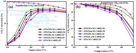 The catalytic activity of 15Ni2R/M-Ce80Zr20 (R = La, Sm, Pr, Yb) catalysts at different reaction temperatures was investigated under the specified conditions (H2/CO2 = 4, GHSV = 12,000 mL/(g∙h), 1 atm), and their catalytic performances are shown in Figure 9. As can be seen from Figure 9a, the rare earth doped 15Ni2R/M-Ce80Zr20 (R = La, Sm, Pr, Yb) catalysts had the higher CO2 conversion rate than that of the original 15Ni/M-Ce80Zr20catalyst. Specifically, 15Ni2La/M-Ce80Zr20 had a much higher CO2 conversion rate than the other catalysts, especially in the low temperature range. In addition, it can be found that the trend of the CO2 conversion curve of the 15Ni2R/M-Ce80Zr20 (R = La, Sm, Pr, Yb) catalysts were completely different from that of the equilibrium CO2 conversion curve. This was mainly due to the contradiction between kinetics and thermodynamics. In particular, according to previous literature [60], CO2 methanation is controlled by the kinetics at low temperatures due to the inert property of the stable CO2 molecule, which is then controlled by thermodynamics at high temperature. Although the lower reaction temperature was theoretically conducive to achieving a higher equilibrium CO2 conversion rate, the large kinetic barrier limited the methanation of CO2 activity at low-temperature. Therefore, the doping of rare earth can greatly improve the CO2 methanation activity of Ni-based catalysts, and La was considered to be the best rare earth modifier among these rare earths. The CH4 selectivity of 15Ni2R/M-Ce80Zr20 (R = La, Sm, Pr, Yb) catalysts at different temperatures is shown in Figure 9b. It can be seen that with the increase in reaction temperature, the equilibrium selectivity of CH4 gradually decreased, which was due to the generation of CO gas at the water gas shift (RWGS) side of the reaction, which reduces the selectivity of CH4 [9,61]. In addition, the CH4 selectivity of the 15Ni2R/M-Ce80Zr20 (R = La, Sm, Pr, Yb) catalysts were higher than that of the 15Ni/M-Ce80Zr20 catalyst. This indicates that rare earth elements also promoted the selectivity of CH4.