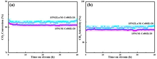 Forty hour long-term stability tests over the 15Ni/M-Ce80Zr20 and 15Ni2La/M-Ce80Zr20 catalysts: (a) CO2 conversion, (b) CH4 selectivity; reaction conditions: H2/CO2 = 4, GHSV = 12,000 mL/(g∙h), 400 °C, 1 atm.