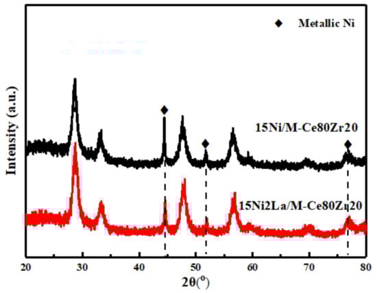 An important problem for CO2 methanation is to conduct long-term stability experiments on catalysts because the exothermic property, the hot sintering of metal Ni active site, led to rapid subsequent deactivation. The 40 h catalytic stability tests at 400 °C were also conducted over 15Ni/M-Ce80Zr20 and 15Ni2La/M-Ce80Zr20 catalysts under the specified conditions (H2/CO2 = 4, GHSV = 12,000 mL/(g∙h), 1 atm) and their profiles are exhibited in Figure 10. As shown in Figure 10a, the CO2 conversions over the 15Ni/M-Ce80Zr20 and 15Ni2La/M-Ce80Zr20 catalysts did not decrease after 40 h stability tests. Furthermore, the 15Ni2La/M-Ce80Zr20 catalyst doped with rare earth also displayed higher activity than the 15Ni/M-Ce80Zr20 single metal counterparts. Its excellent performance should be attributed to the limiting effect of mesoporous skeleton on the stabilization of metal Ni active sites, forming a strong metal-skeleton interaction in the mesoporous skeleton. Similarly, it was noticeable in Figure 10b that the CH4 selectivity over the 15Ni/M-Ce80Zr20 and 15Ni2La/M-Ce80Zr20 catalysts were also stable during the stability tests, suggesting that severe hot sintering of the metal Ni active center had been effectively avoided. The stable catalytic activities and selectivity over the 15Ni/M-Ce80Zr20 and 15Ni2La/M-Ce80Zr20 catalysts could be attributed to the outstanding sintering-proof properties. In general, the 15Ni2La/M-Ce80Zr20 catalyst was provided with not only advanced low-temperature activity, but also outstanding catalytic stability. Figure 11 shows the XRD analysis of the spent 15Ni/M-Ce80Zr20 and 15Ni2La/M-Ce80Zr20 catalysts after 40 h long-term stability tests. The results showed that the catalyst exhibited the characteristic peak of Ni (PDF-#-45-1027) after the stability test. Moreover, the metal Ni peak of 15Ni2La/M-Ce80Zr20 was weaker than that of 15Ni/M-Ce80Zr20, which indicated that 15Ni2La/M-Ce80Zr20 had better dispersion of metal Ni. The FWHM reflected the diameter of metal Ni in the catalysts. The smaller the diameter, the larger the FWHM that can be obtained. It could be obtained that the FWHM of the metal Ni diffraction peak of 15Ni2La/M-Ce80Zr20 was higher than that of 15Ni/M-Ce80Zr20, which indicated that the metal Ni in 15Ni2La/M-Ce80Zr20 was smaller and could be uniformly distributed in the catalysts. Therefore, due to the mesoporous structure of M-Ce80Zr20, 15Ni2La/M-Ce80Zr20 showed excellent thermal sintering resistance.