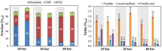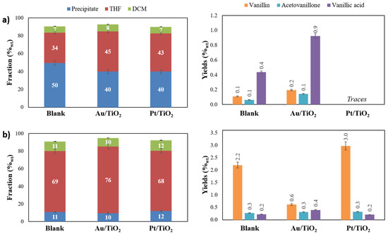 The influence of air pressure over lignin catalyzed depolymerization by Pt/TiO2 was also evaluated (Figure 2). While the presence of the catalyst had almost no significant effect on the quantity of “DCM” and “THF” fractions retrieved, the amount of “precipitate” recovered increased by 12 wt% and 4 wt% at 10 and 20 bar respectively. However, the same effect was not observed when the experiment was done at 40 bar. While the role of catalyst is very limited on the quantity of three fractions obtained, its use modified the selectivity of aromatics, mainly improving yields of vanillin. Catalytic oxidation appeared to show the same trend displayed without catalyst, i.e., a rise of vanillin yield from 10 to 20 bar before slightly decreasing to 40 bar. Interestingly, the presence of Pt/TiO2 did not improve the yield of vanillin at 10 bar (ca. 2.6 wt%) while it increased the selectivity towards vanillin when the reactions were realized at 20 bar (from 2.8 wt% to 3.4 wt%) and 40 bar (from 2.2 wt% to 3 wt%). Noticeably, at a pressure of 10 bar, the yield of vanillic acid decreased from 1.7 to 1.2 wt% with Pt/TiO2, therefore suggesting a difference of production mechanism by lignin oxidation of vanillin and vanillic acid already observed in our previous report [13].