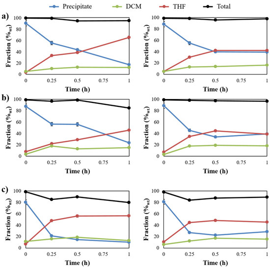 Evolution of the three product fractions (i.e., precipitate, DCM and THF) versus time during non-catalytic (left) and catalytic (right) oxidation for Kraft (a), EOL-Ab (b) and EOL-As (c) lignins.