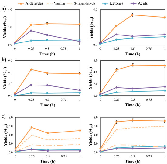 Evolution of the yields of the main aromatic compounds in “DCM” fraction during non-catalytic (left) and catalytic (right) oxidation for Kraft (a), EOL-Ab (b) and EOL-As (c) lignins. Aldehydes, ketones and acids equal to vanillin, acetovanillone and vanillic acid resp. for softwood lignins.